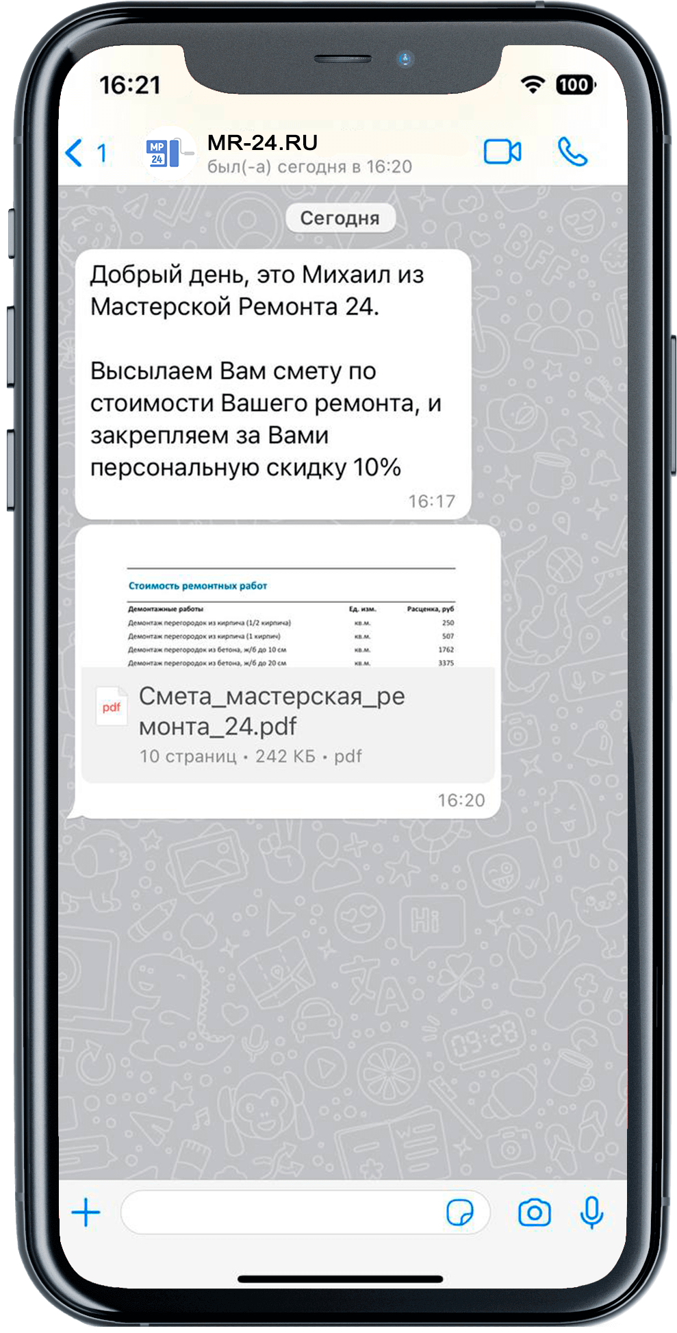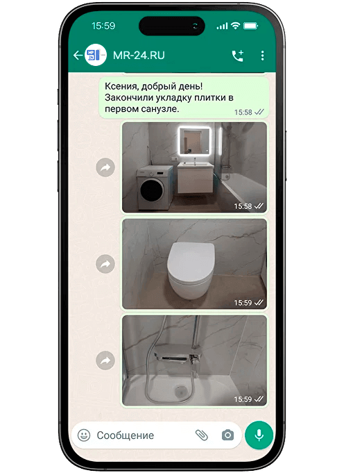 Прораб (производитель работ) всегда на связи по телефону и в мессенджерах WhatsApp, Telegram, Viber. Также мы всегда отправляем вам еженедельные детальные фото и видео-отчеты с объекта, чтобы Вы были в курсе на каком этапе находится работа по Вашему объекту.